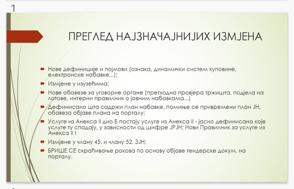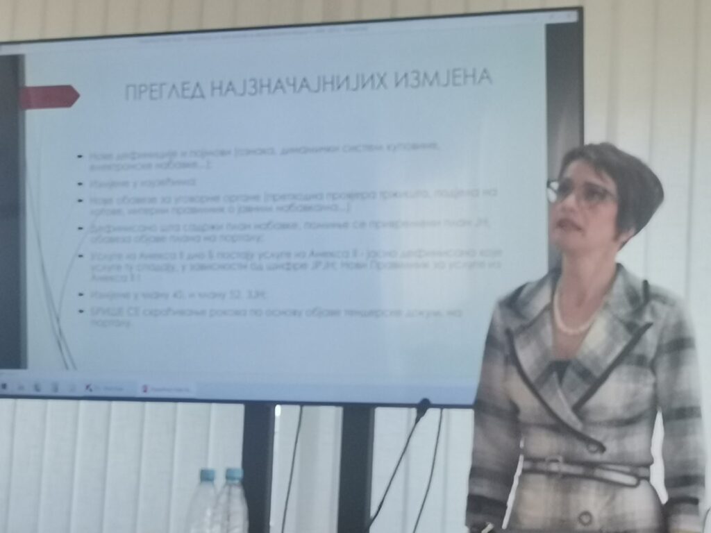 Хвала госпођи Мирјани Гајић(виши сарадник за јавне набавке, Одјељење за финансијско – планске и рачиноводствене послове-овлаштени предавач из области јавних набавки) што је пидијелила стручна знања и искуства из ове области, а посебна пажња је посвећена измјенама и допунама Закона о јавним набавкама…