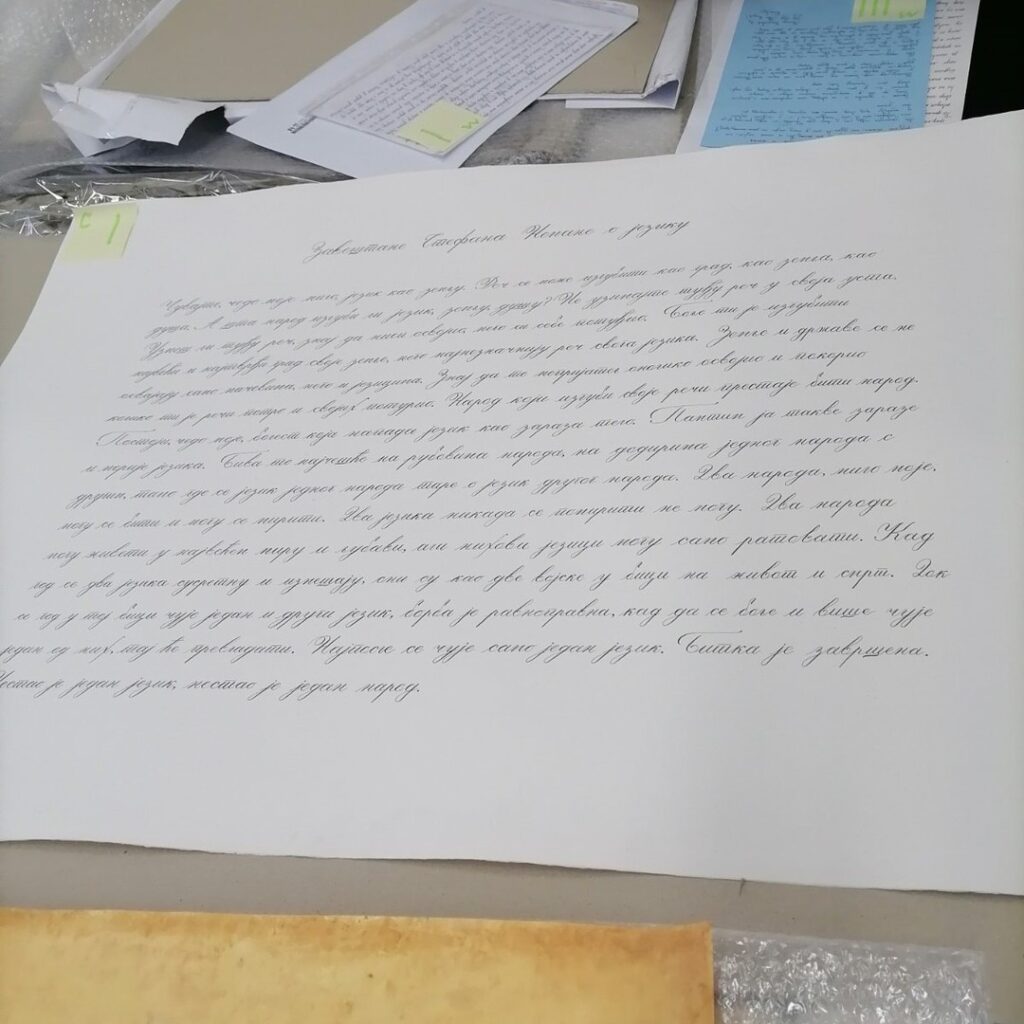 • Пошто је конкурс био објављен за рукопис, предност су имали радови писани писаним словима повезаним лигатурама у односу на радове писане калиграфским словима без лигатура.