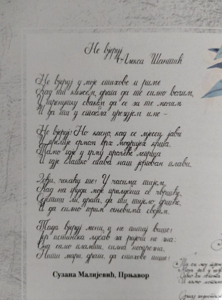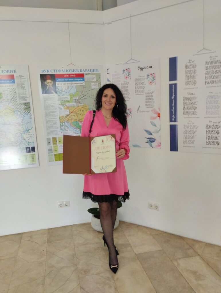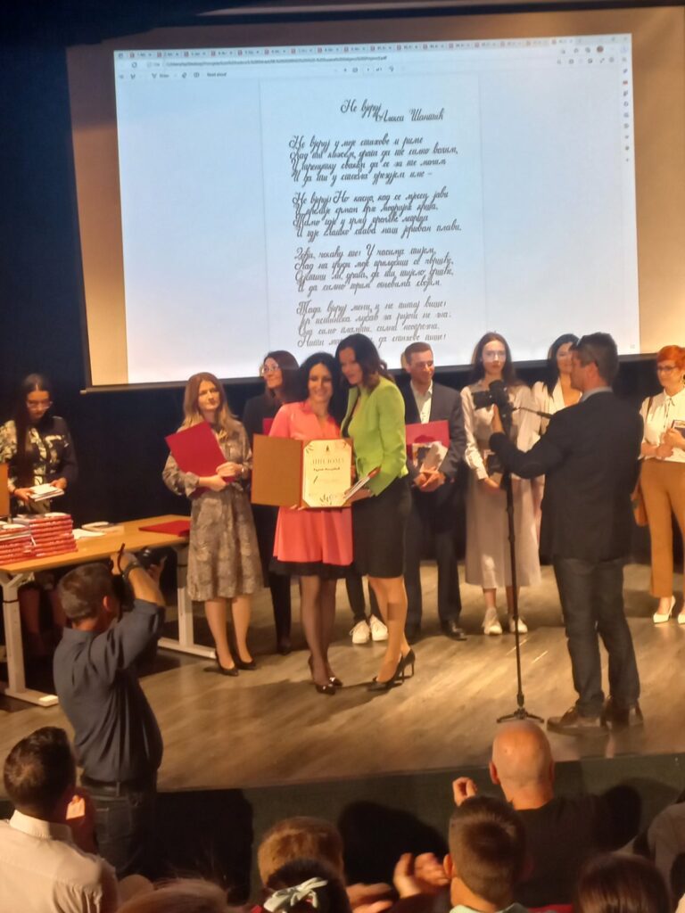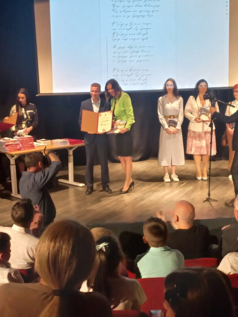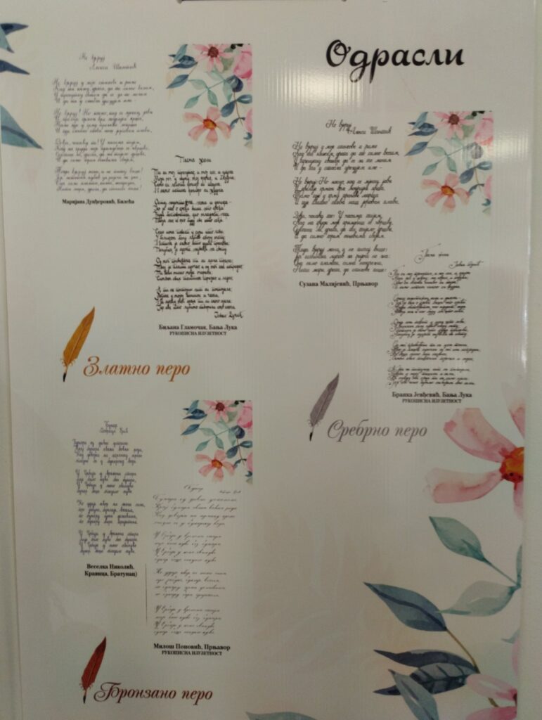 Међу награђенима су и наши професори Сузана Малијевић, која је награђена наградом Сребрно перo за ћирилични краснопис (2. мјесто) и Милош Поповић који је награђен наградом Бронзано перо за рукописну изузетност (3. мјесто). Искрене честитке нашим професорима, нарочито имајући у виду да се ради о професорима биологије и професору информатике а не професорима српског језика.