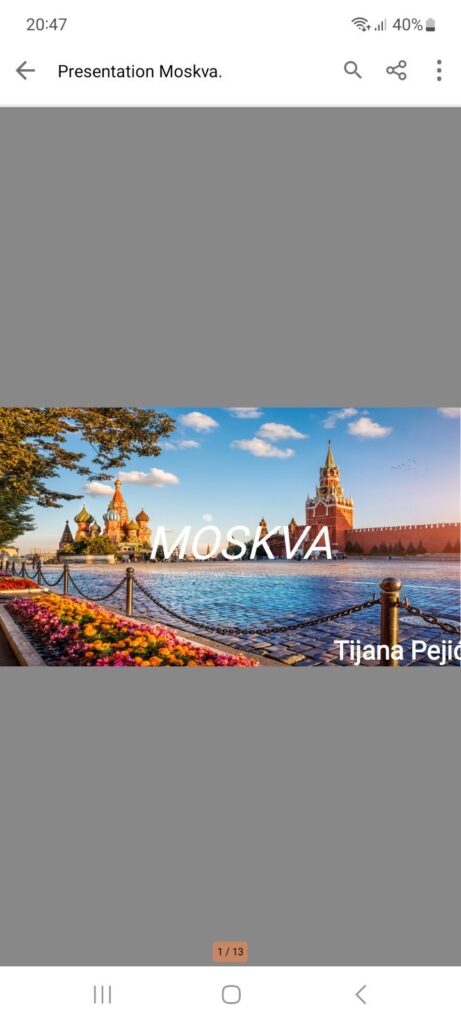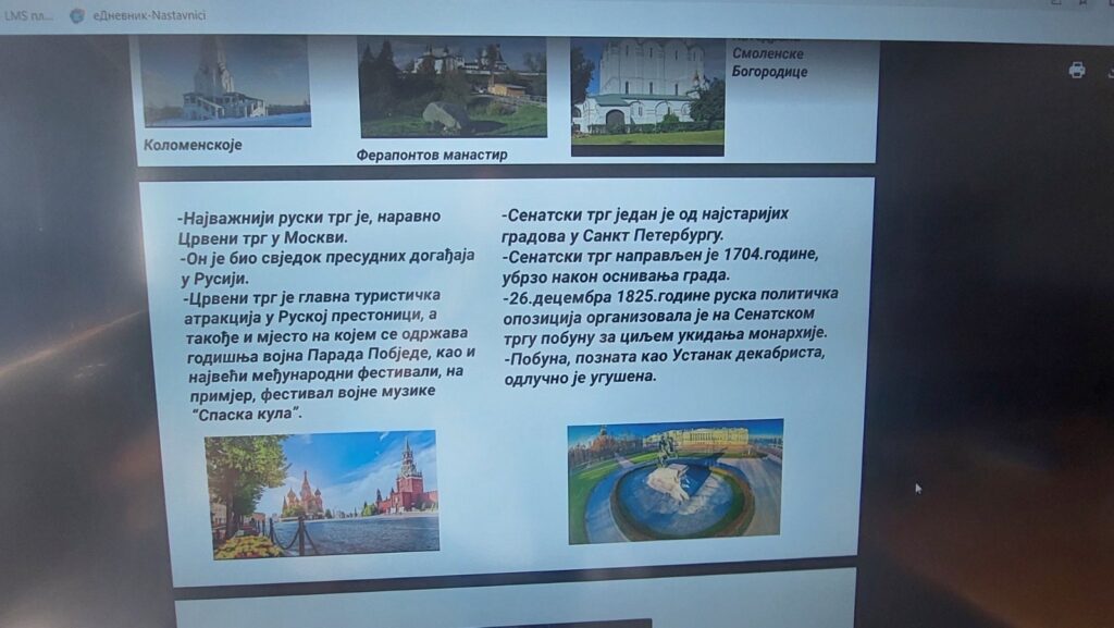 Ученице првог разреда припремиле су презентације: Тијана Пејић I2 Москва-географске одлике док је ученица I5 Бојана Девић припремила презентацију о Русији, култури и традицији руског народа.
