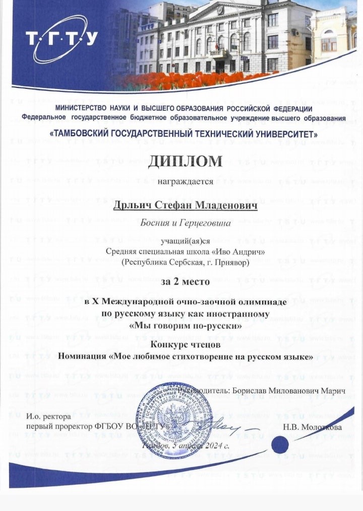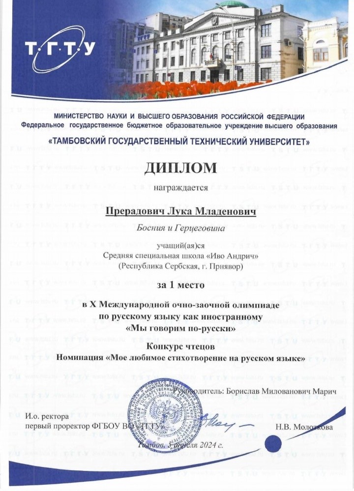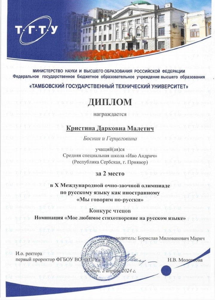 Данас су објављени резултати са Међународног такмичења из руског језика, које се спроводи у онлајн формату у граду Тамбову, Русија ” Мы говорим по русски”, гдjе су се 4 ученика наше школе такмичила у категорији “Моё любимое стихотворение на русском языке”. Ученик Лука Прерадовић I4, освојио је прво мјесто, ученици Стефан Дрљић IV3 и Кристина Малетић I2, освојили су друго мјесто а Ана Љубојевић III2, освојила је треће мјесто. Ученици су се такмичили у конкуренцији средњошколаца са другим ученицима који уче руски језик као страни језик.