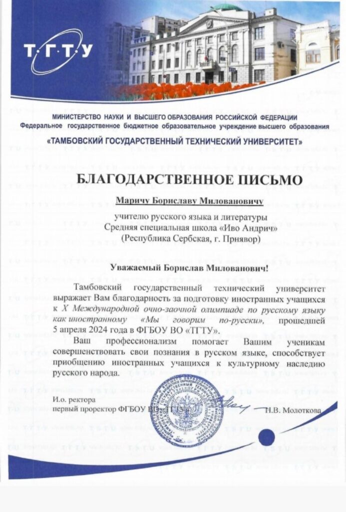 Ученике је припремао професор руског језика, Борислав Марић, који је и званично отворио такмичење и добио захвалницу Тамбовског државног универзитета.