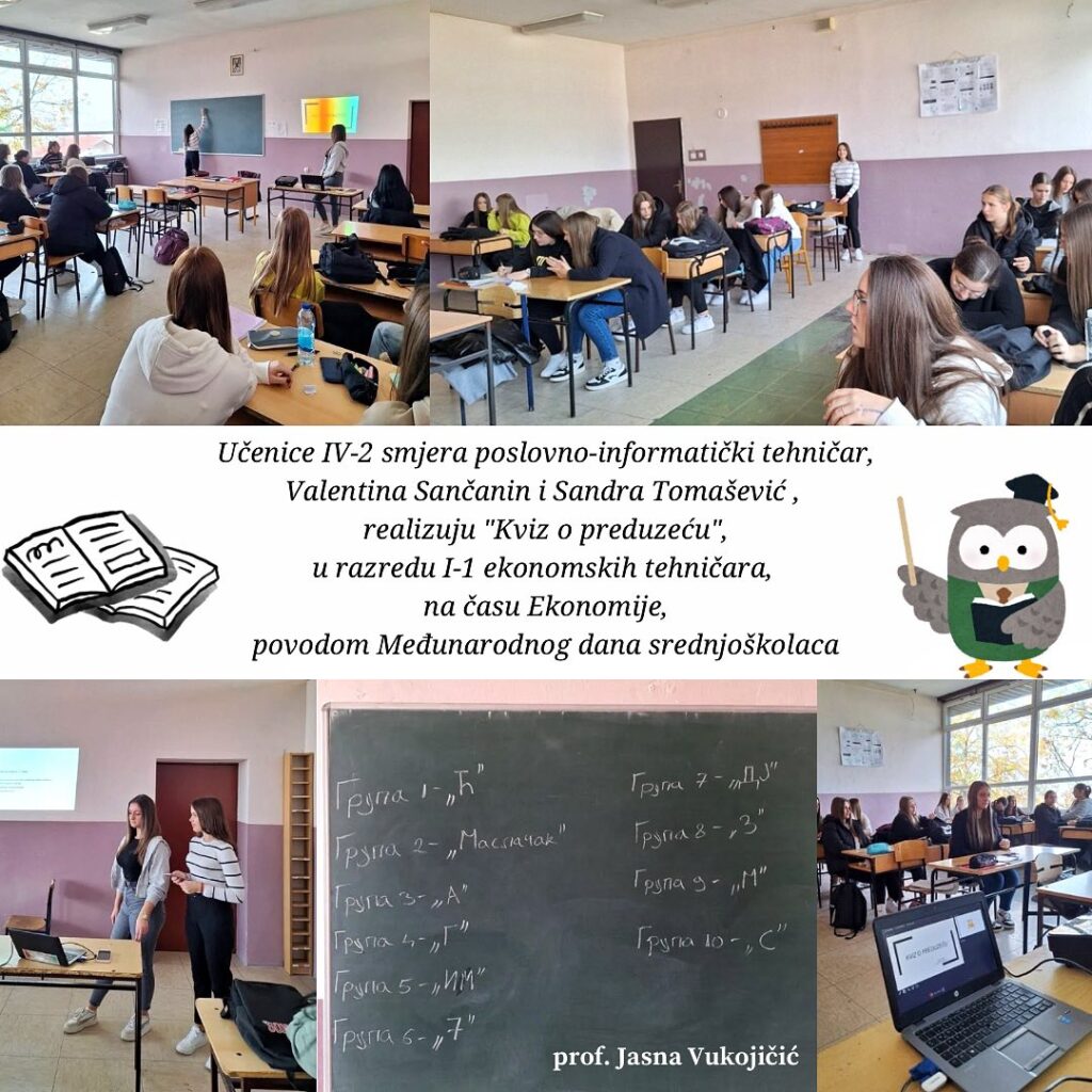 Такође, и ученици I1 eкономских техничара имали су прилику да своја знања из области економије покажу на такмичарском квизу. Водитељке “Квиза о предузетништву” биле су Валентина Санчанин и Сандра Томашевић, ученице IV разреда пословно-информатичких техничарa. Поменуте ученице су припремиле и реализовале квиз под менторством професорице Јасне Вукојичић.