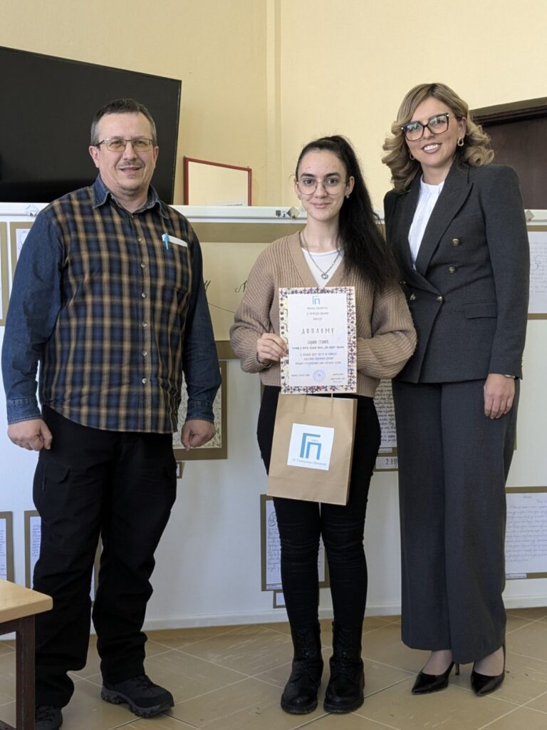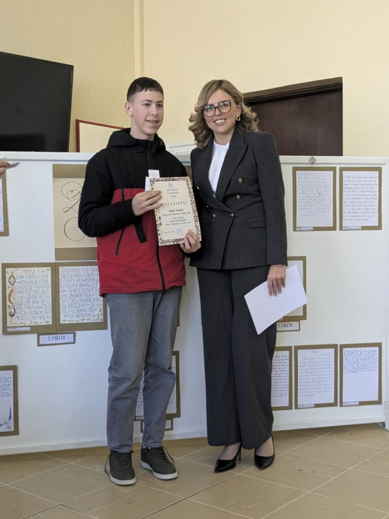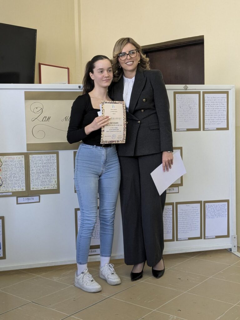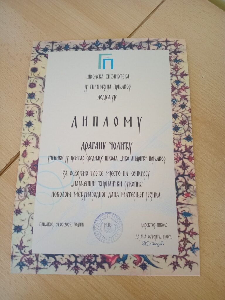 На конкурсу за избор најљепшег ћириличног писма, који је у ЈУ Гимназија Прњавор расписан поводом Међународног дана матерњег језика, наши ученици постигли су одличне резултате. Ученица Бојана Станић освојила је друго, а Драган Чолић треће мјесто! Захвалницу за учешће добили ду и ученици Анђела Грујић, Сандра Прерадовић и Давид Миладић.