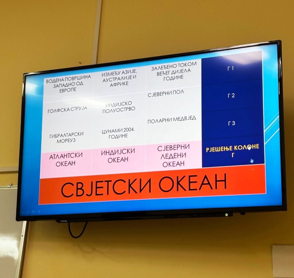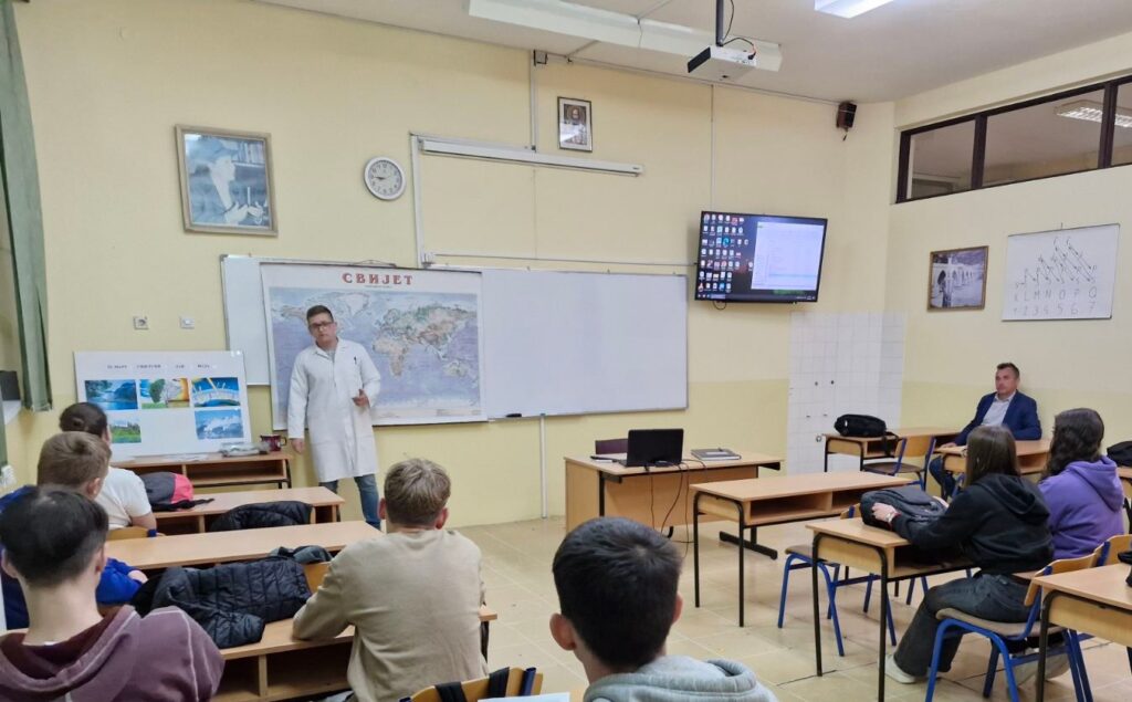 Наш професор географије, Александар Вучановић, одржао је ученицима занимљиво, а истовремено едукативно предавање, као и квиз знања. Након уводне ријечи, катедру је препустио ученици Мињи Дебељак која је за своје другаре припремила веома интересантну презентацију. Препуна жеље за усвајањем и преношењем знања, Миња је између осталог саопштила да је 21. март проглашен као Свјетски дан ледника и да ће се од ове године обиљежавати сваке године уочи 22. марта Свјетског дана вода.