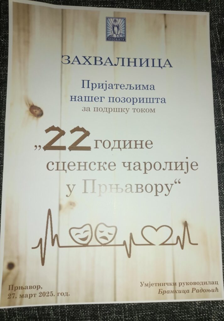 ЗАХВАЛНИЦА ДРАМСКЕ СЦЕНЕ СПКД “ПРОСВЈЕТА” ПРЊАВОР