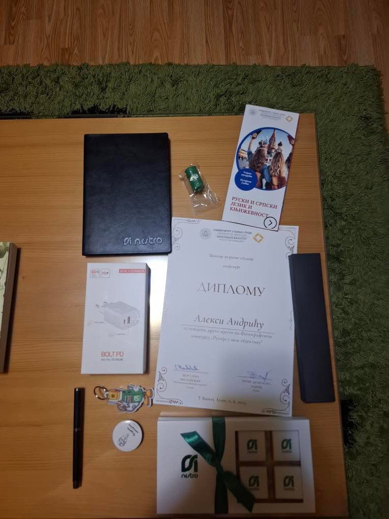 Наш ученик Алекса Андрић освојио је II мјесто у конкурсу “Русија у мом објективу”. Ученик и професор руског језика били су на матурској екскурзији па је награду преузео његов брат Ђорђе Андрић, матурант наше школе